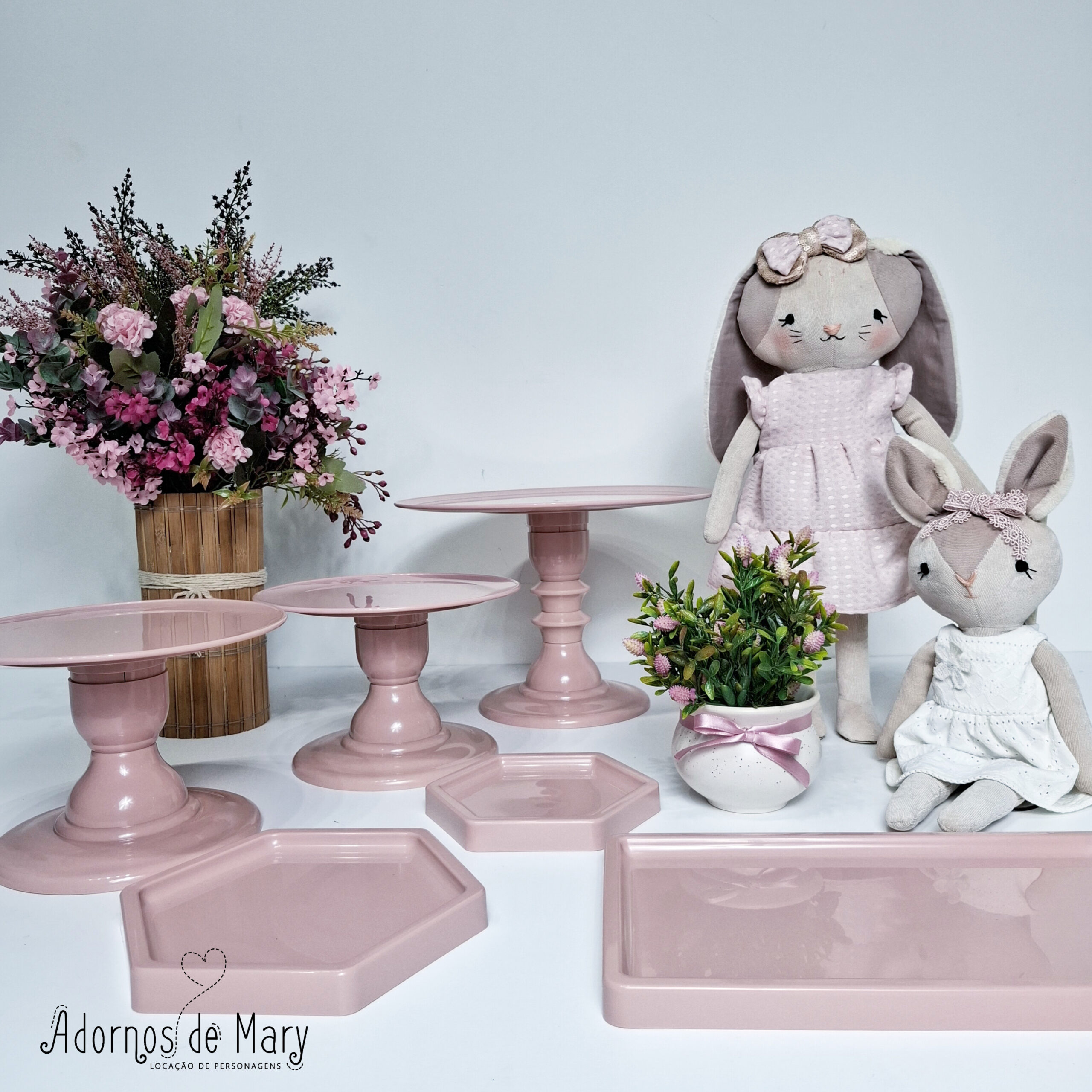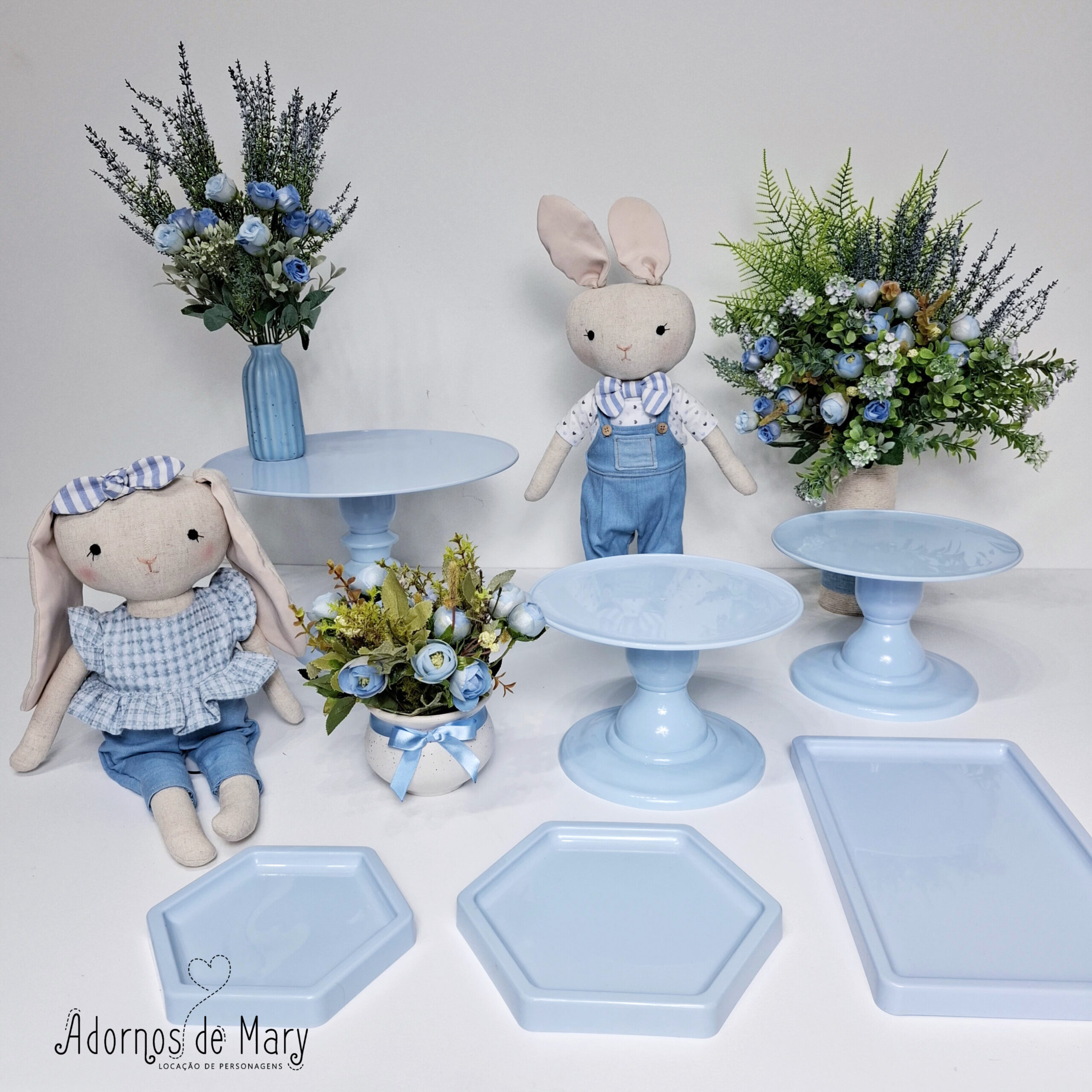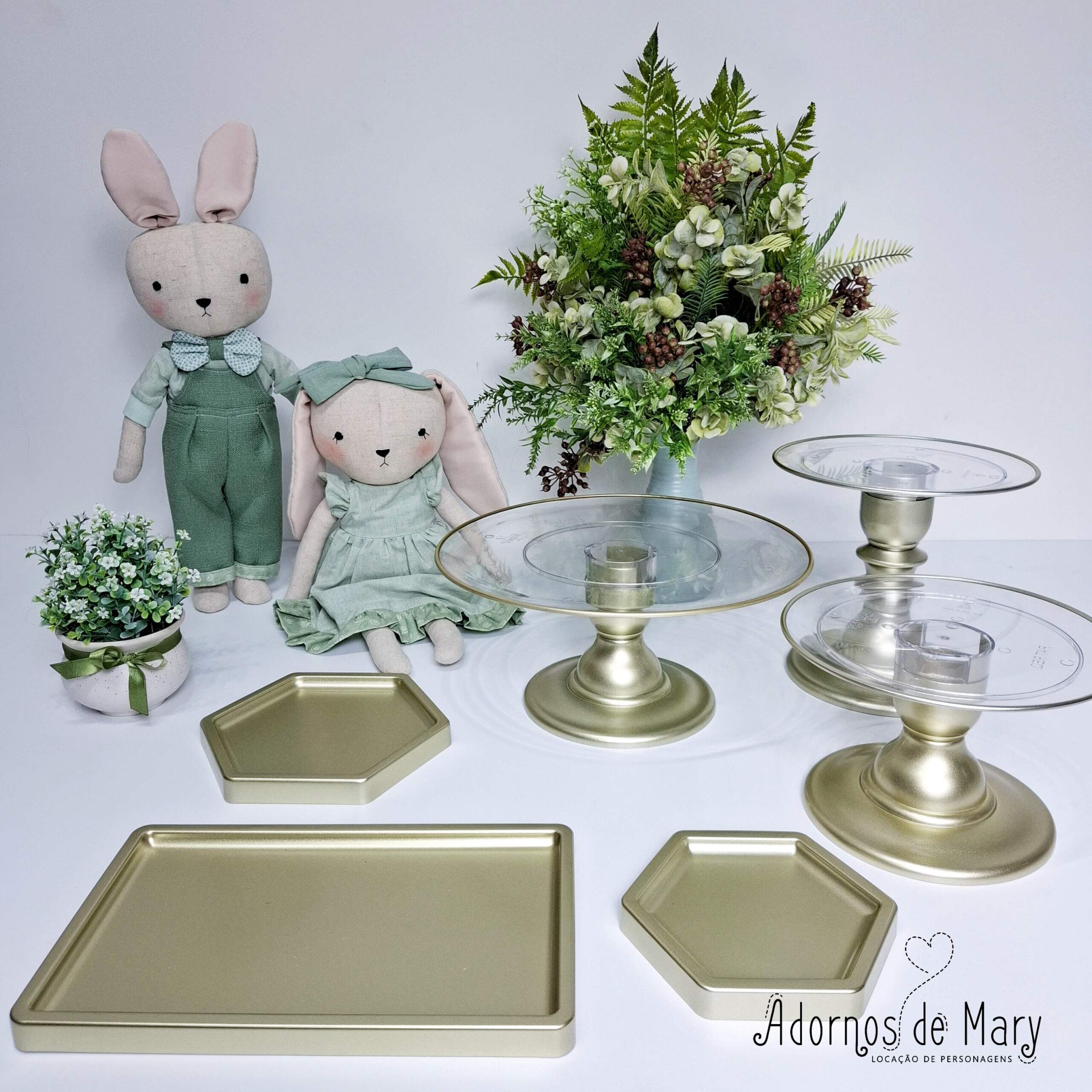 Mini cenário Páscoa. Contém: 1 Coelho em pé 41 cm, 1 Coelha sentada 26 cm, 2 boleiras 22 x 14,5, 1 boleira 32 x 19,5, 1 bandeja sextavada 15 cm, 1 bandeja sextavada 18 cm, 1 bandeja retangular 30x18cm, 2 arranjos de flores permanentes.