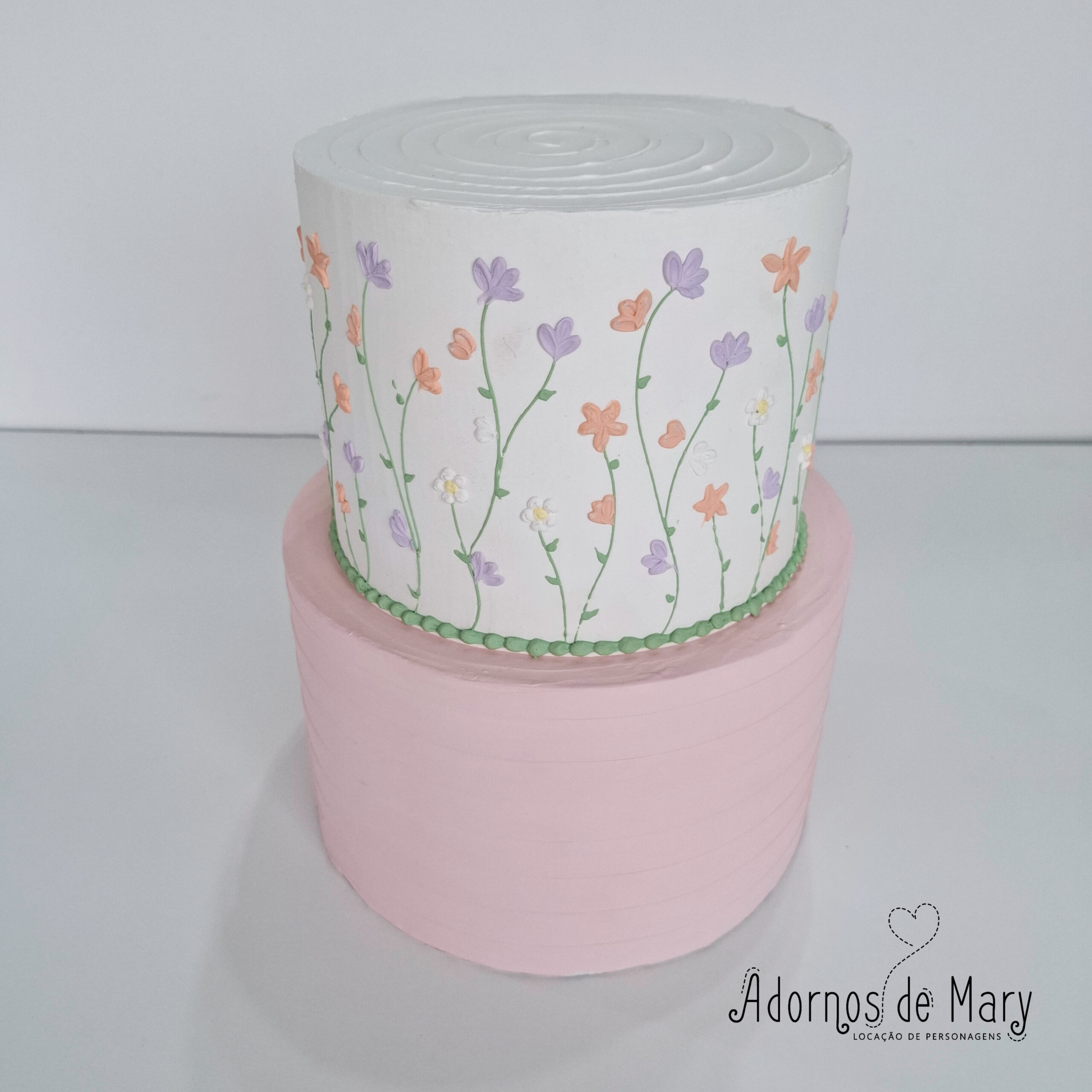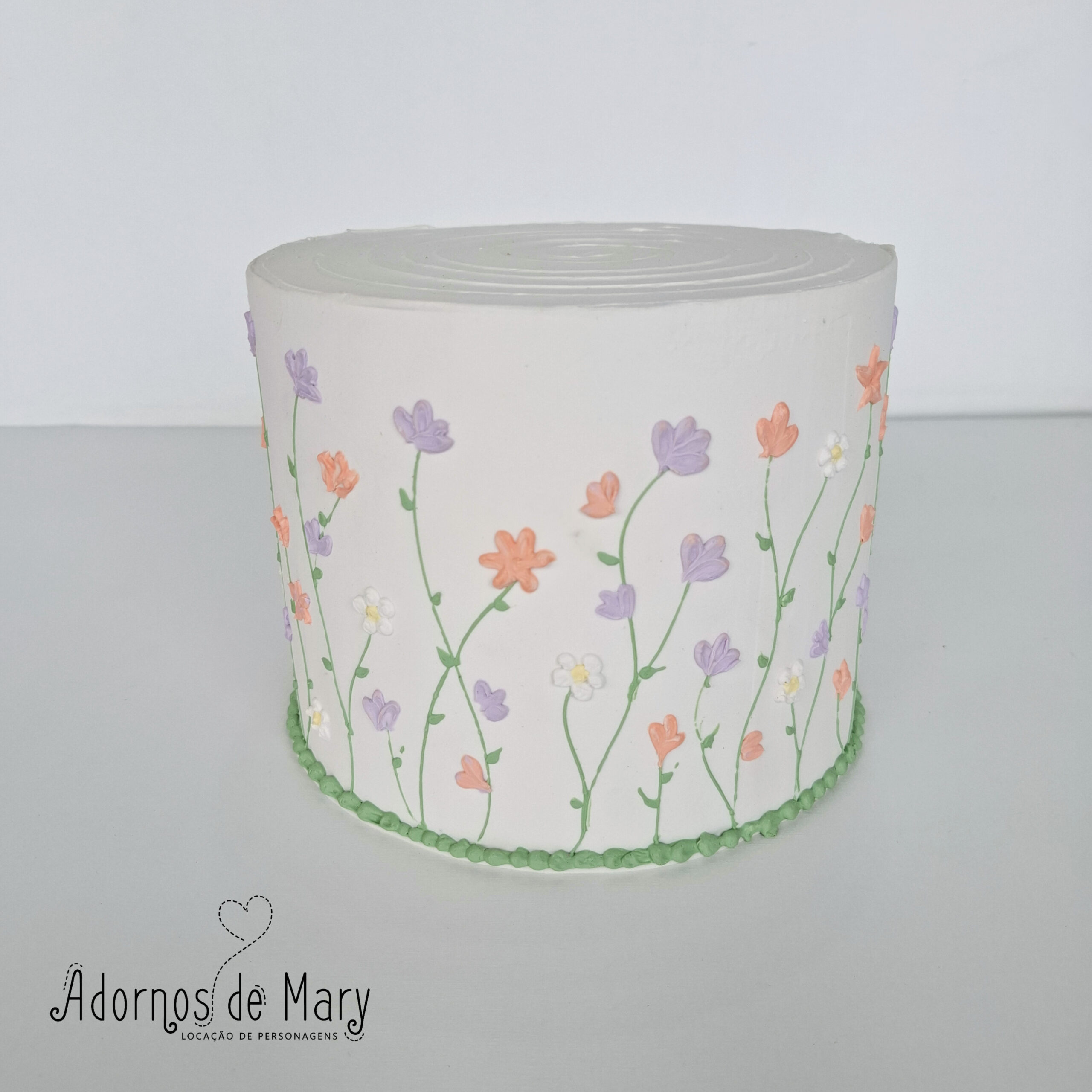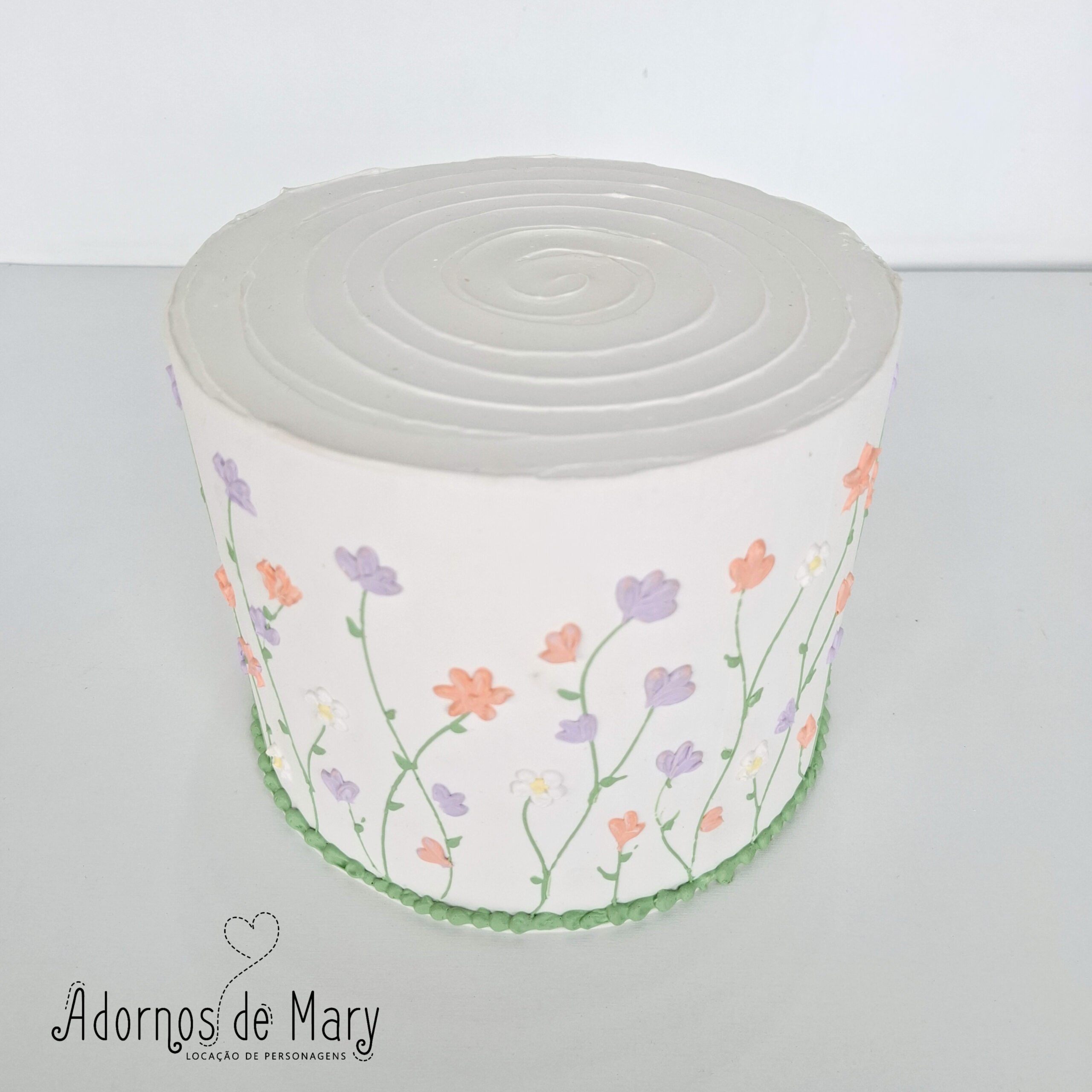 Bolo espatulado de flores (1) lilás, produzido com chantilly fake. Mede aproximadamente, 20 cm de diâmetro e 15 cm de altura.