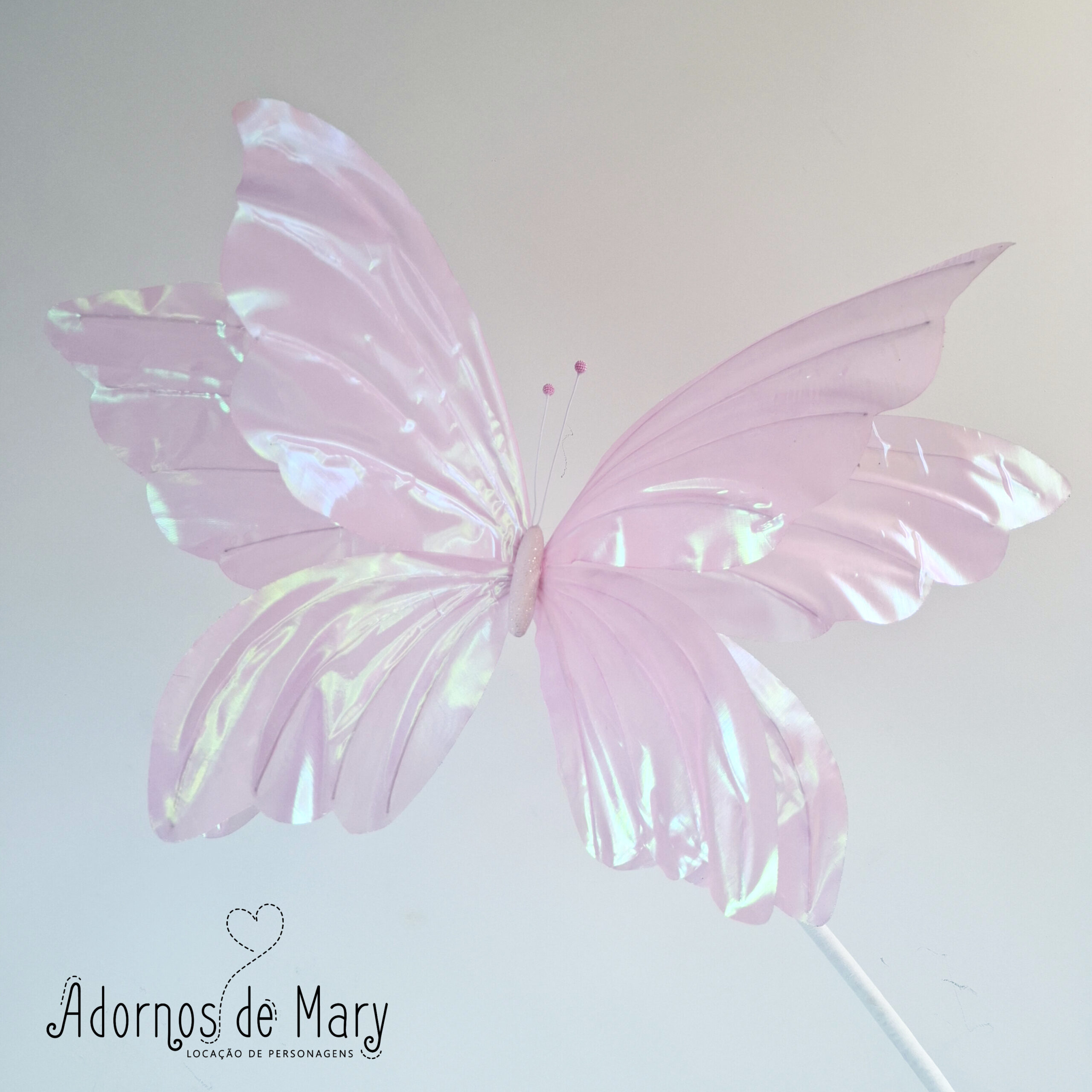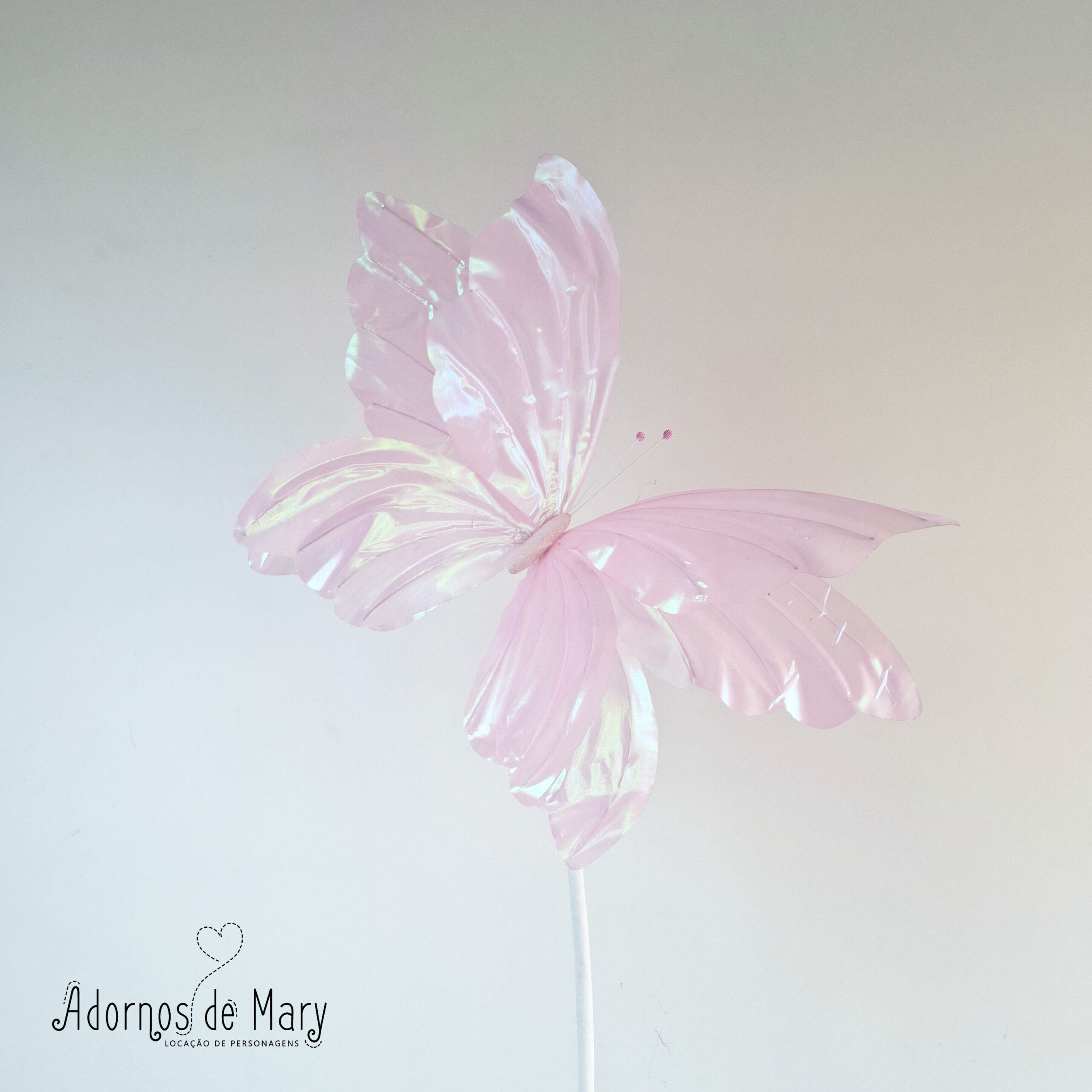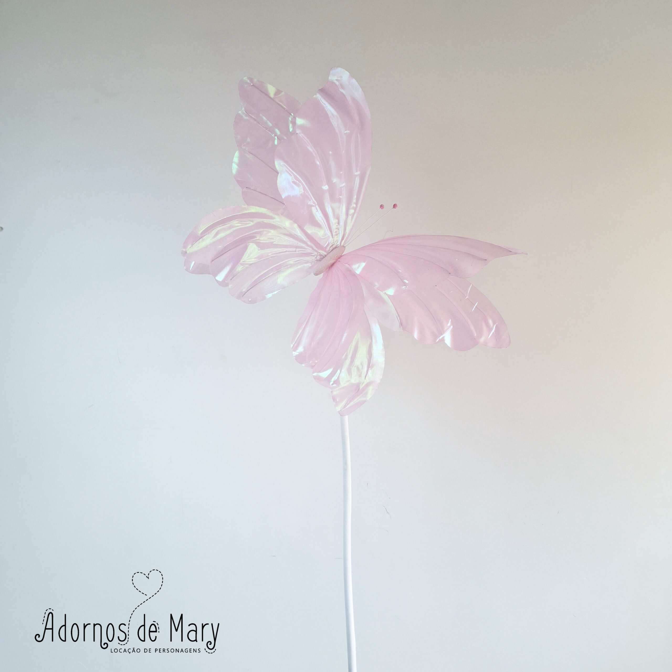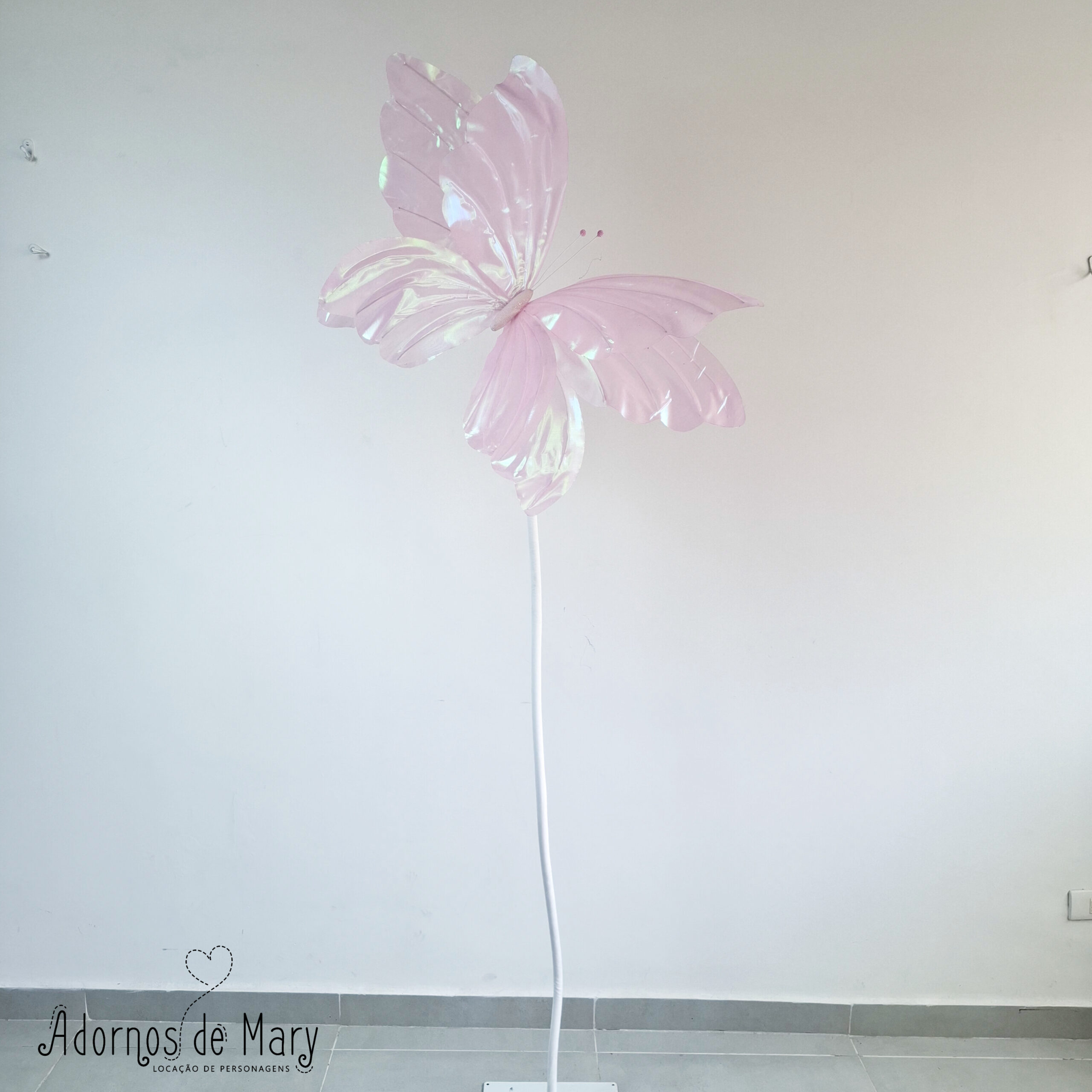 Borboleta gigante holográfica rosa (1). Confeccionada artesanalmente em tecido. Mede aproximadamente: 1,90 de altura x 0,80 cm de largura. Contém 1 borboletas, 1 hastes, 1 pedestal.