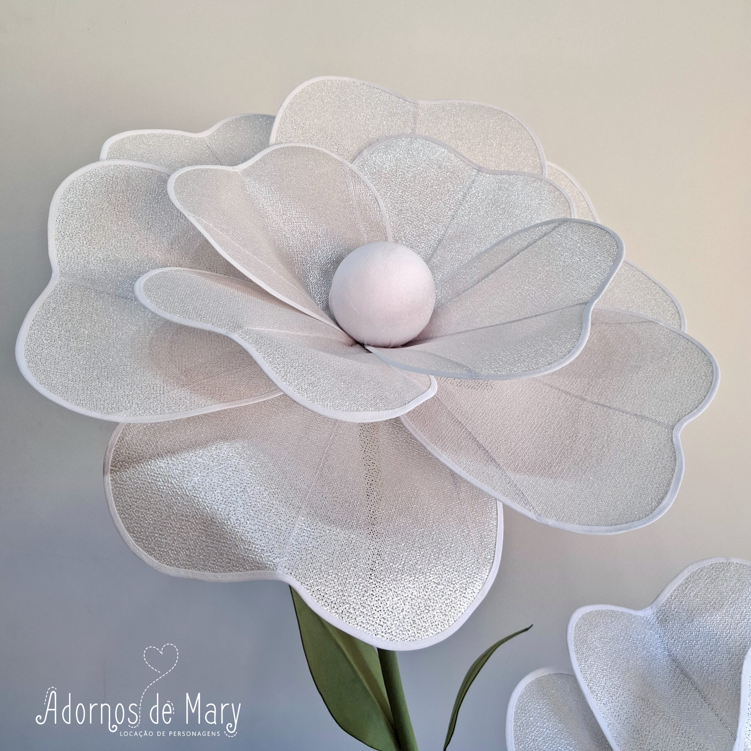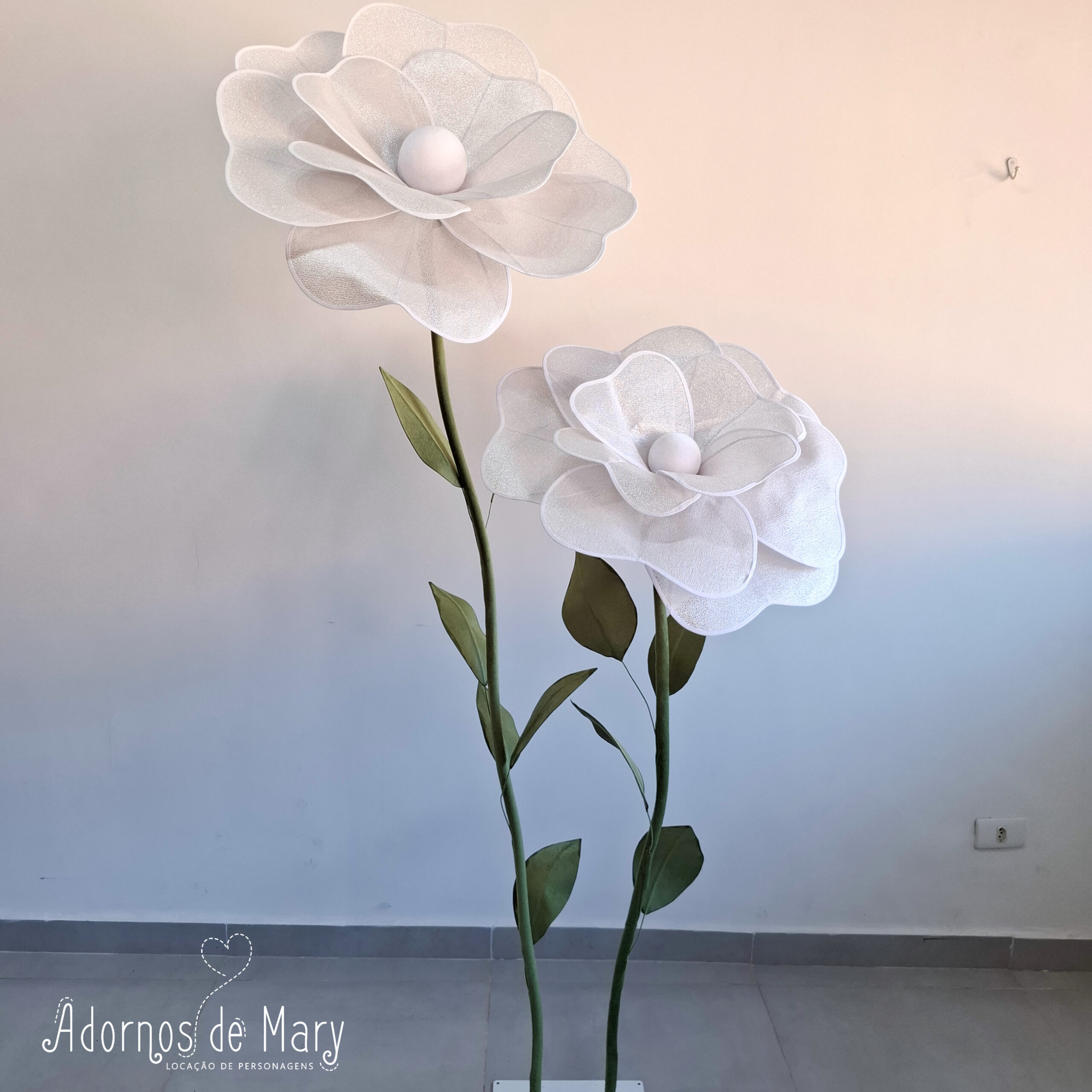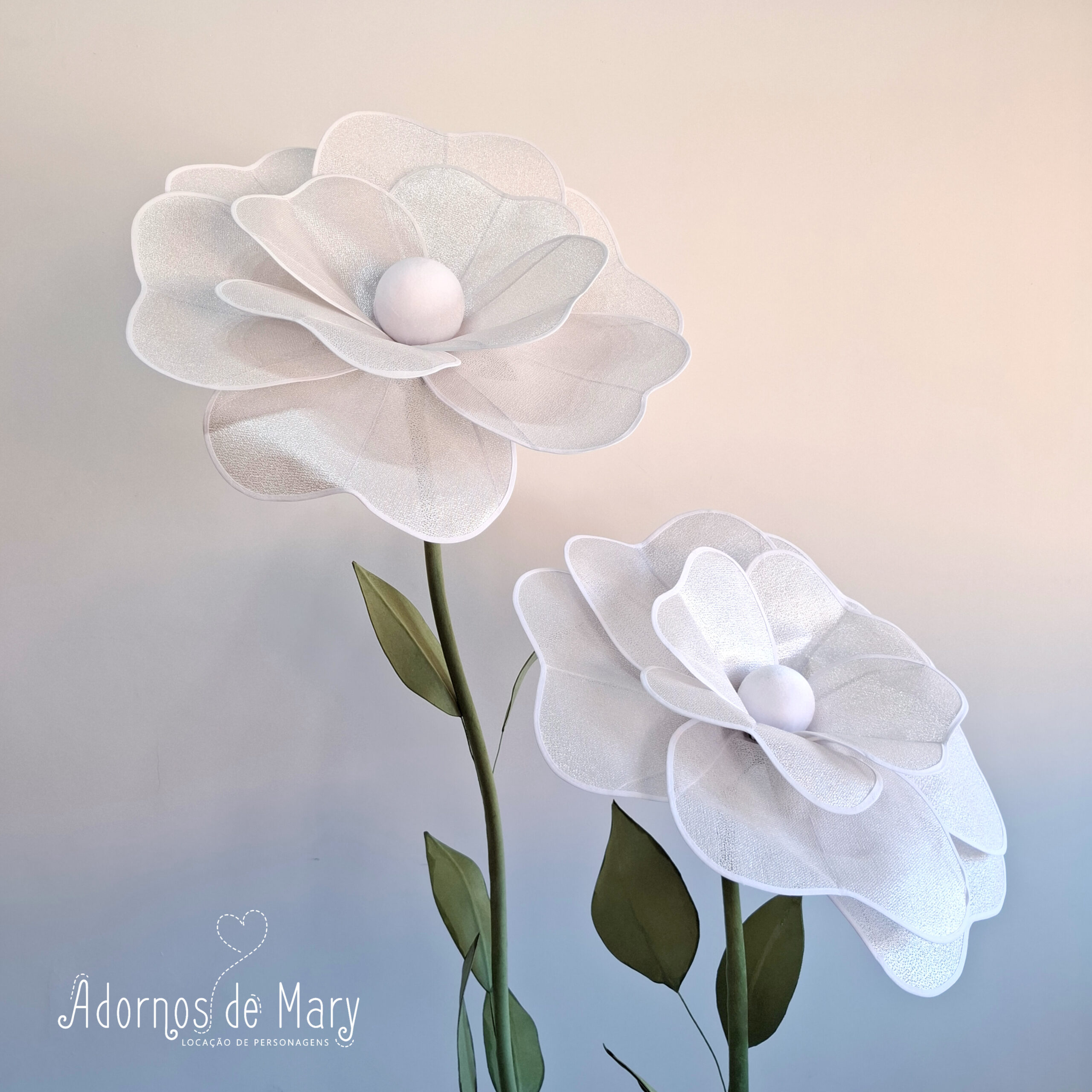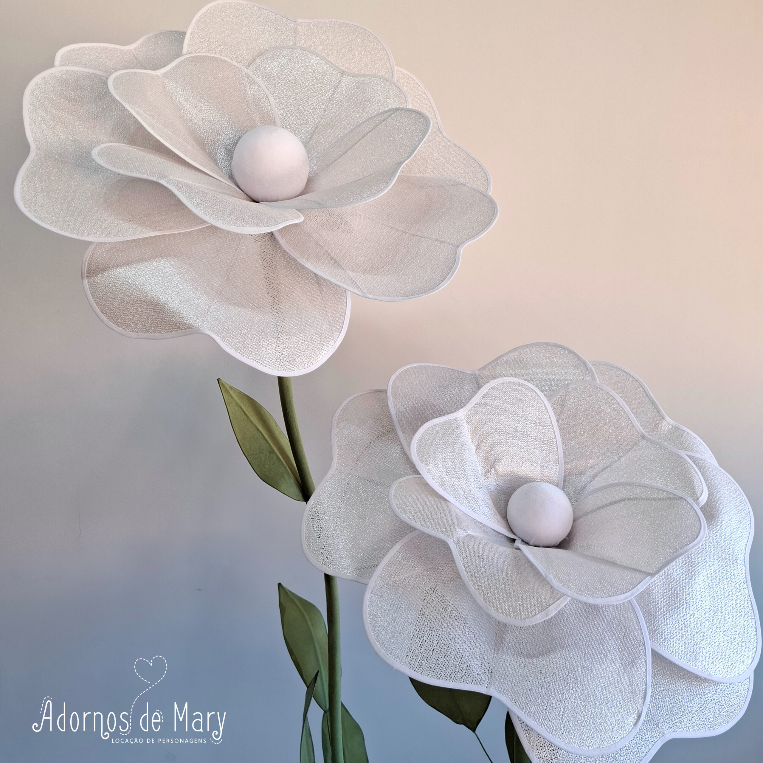 Flor gigante telada Branco perolado (12). Contém duas hastes, duas flores gigantes e uma base.