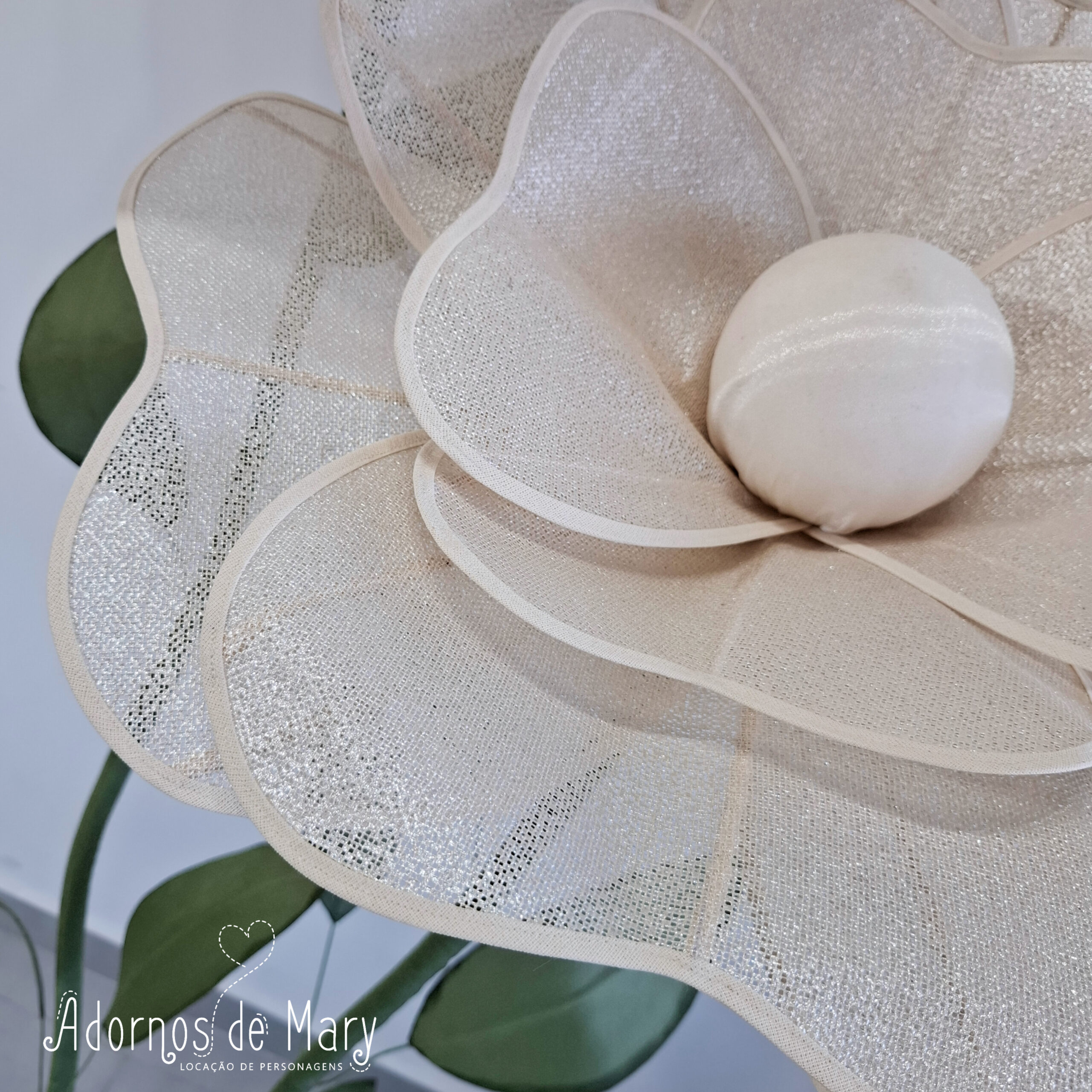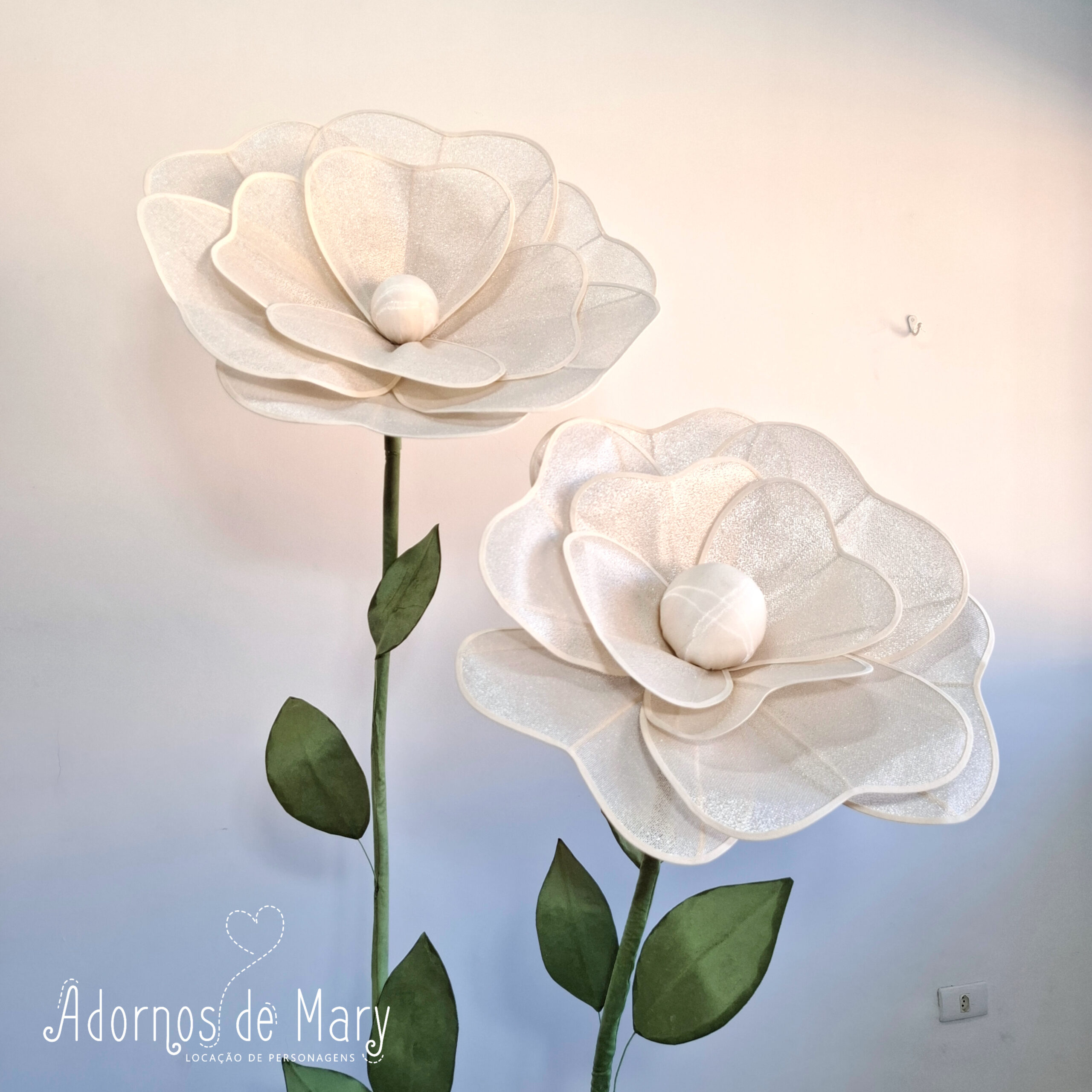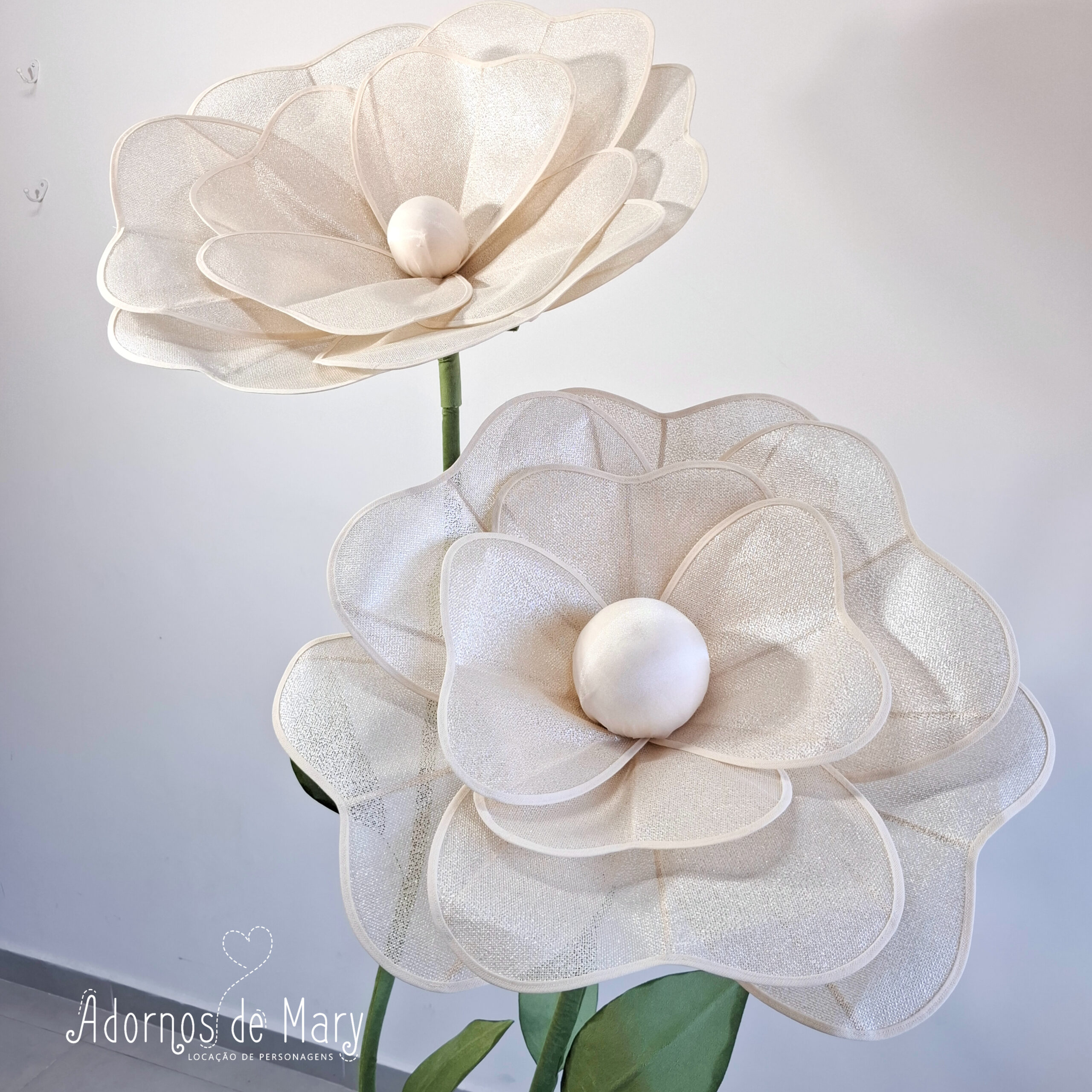 Flor gigante telada off white perolado (1). Contém duas hastes, duas flores gigantes e uma base.