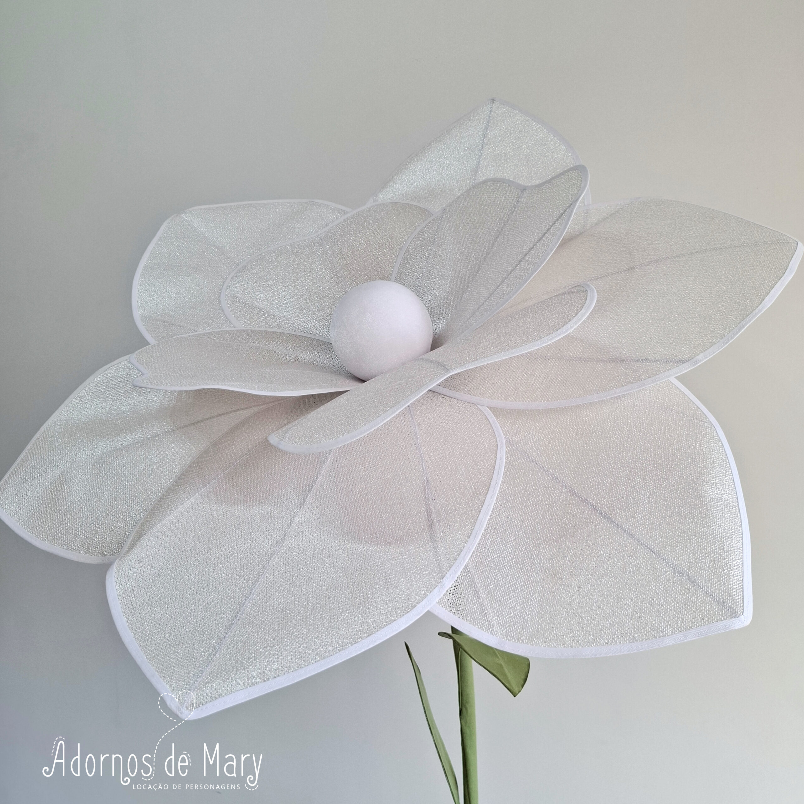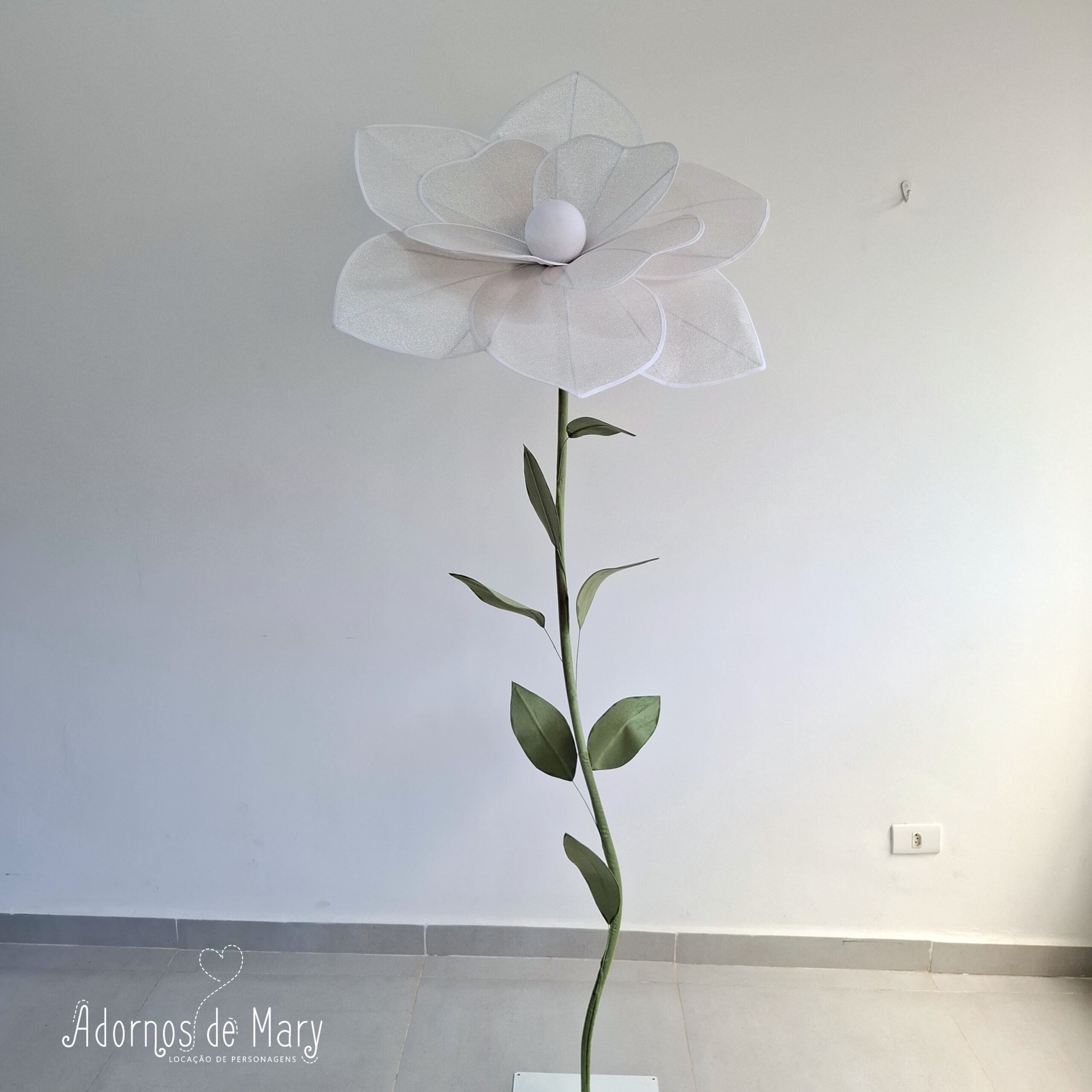Flor gigante telada unitária branca perolada (14). Contém 1 haste, 1 flor e uma base. Mede aproximadamente: 2,00 de altura x 70 de diâmetro.