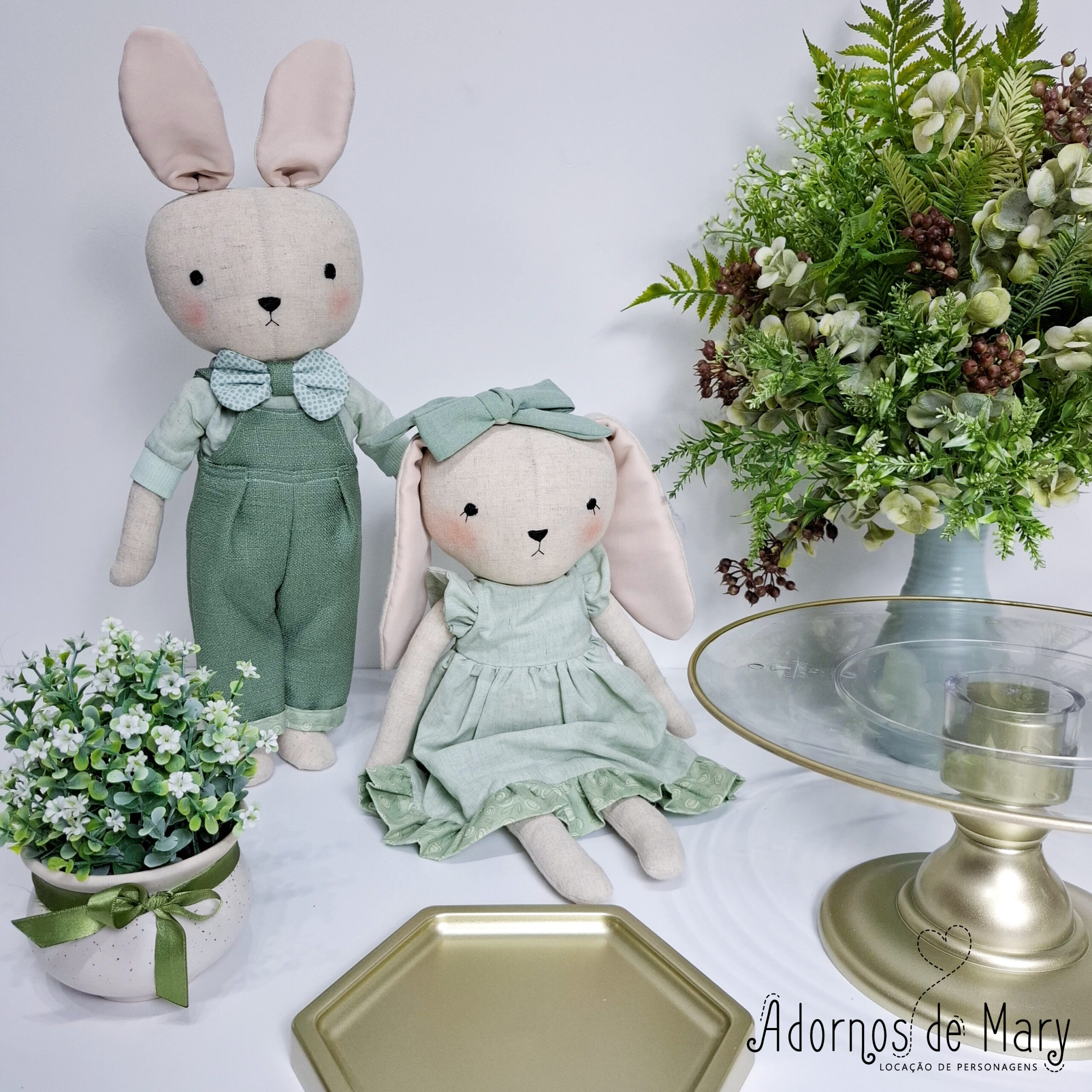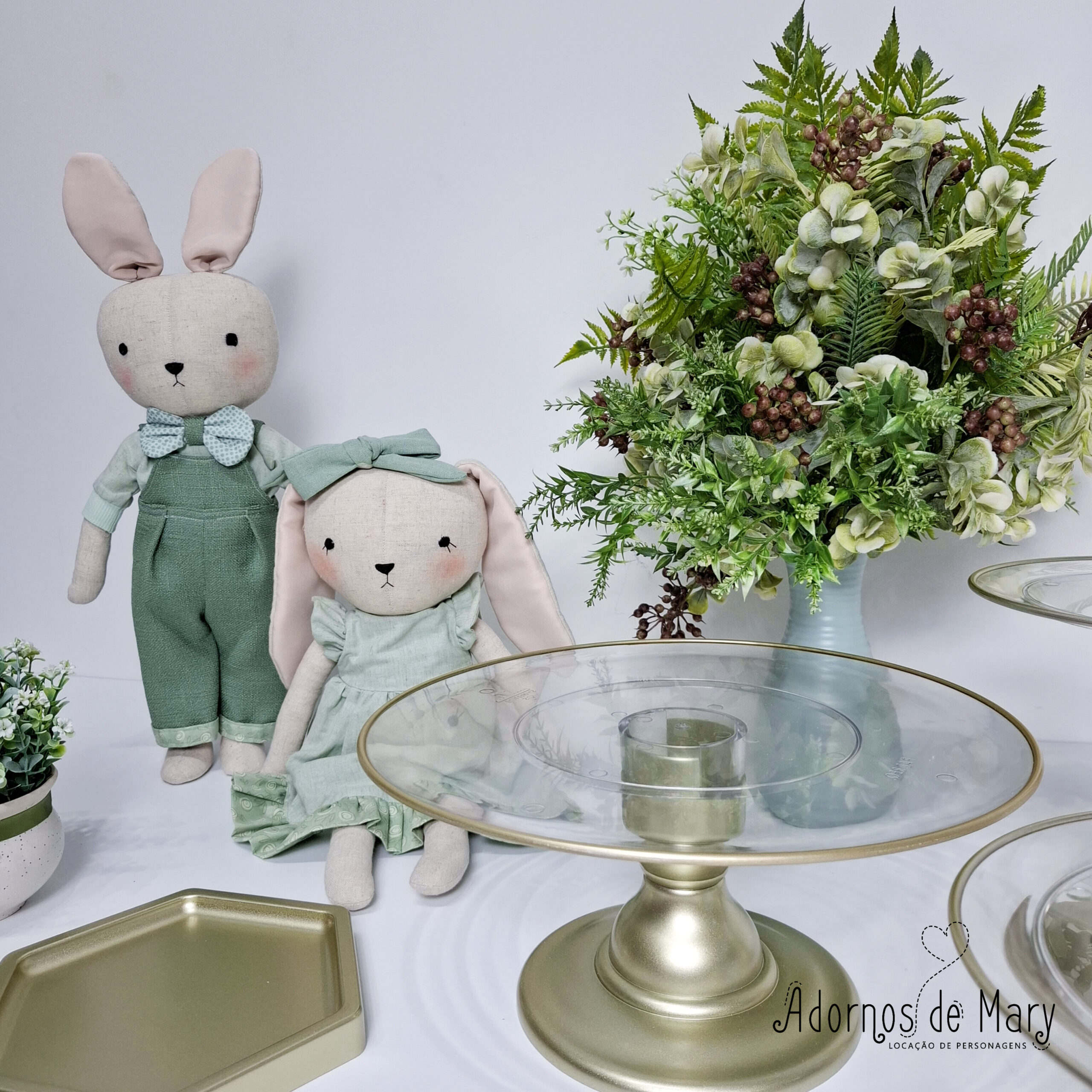 Mini cenário Páscoa. Contém: 1 Coelho em pé 41 cm, 1 Coelha sentada 26 cm, 2 boleiras 22 x 14,5,  1 boleira 32 x 19,5, 1 bandeja sextavada 15 cm, 1 bandeja sextavada 18 cm, 1 bandeja retangular 30x18cm, 2 arranjos de flores permanentes.